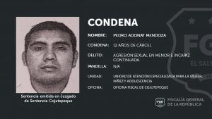 Cojutepeque, Cuscatlán. Pedro Adonay Mendoza agredió sexualmente y de forma continuada a una menor de 10 años, por lo que fue condenado a 12 años de prisión. Así lo afirmó la Fiscal del caso de la Unidad de Atención Especializada para la Mujer, Niñez y Adolescencia de la sede en Cojutepeque.