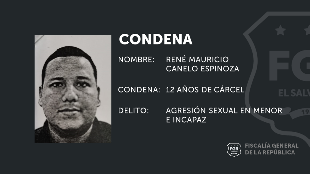 El haber realizado tocamientos de forma indebida a una menor de edad llevó a que René Mauricio Canelo Espinoza, deba cumplir un total de 12 años en prisión, según lo confirmó esta tarde la Fiscalía General de la República.