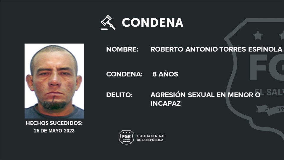Chalatenango. Roberto Antonio Torres Espínola fue condenado a 8 años de cárcel por agredir sexualmente a una menor de 5 años de edad. Los abusos se cometieron el 25 de mayo del 2023.