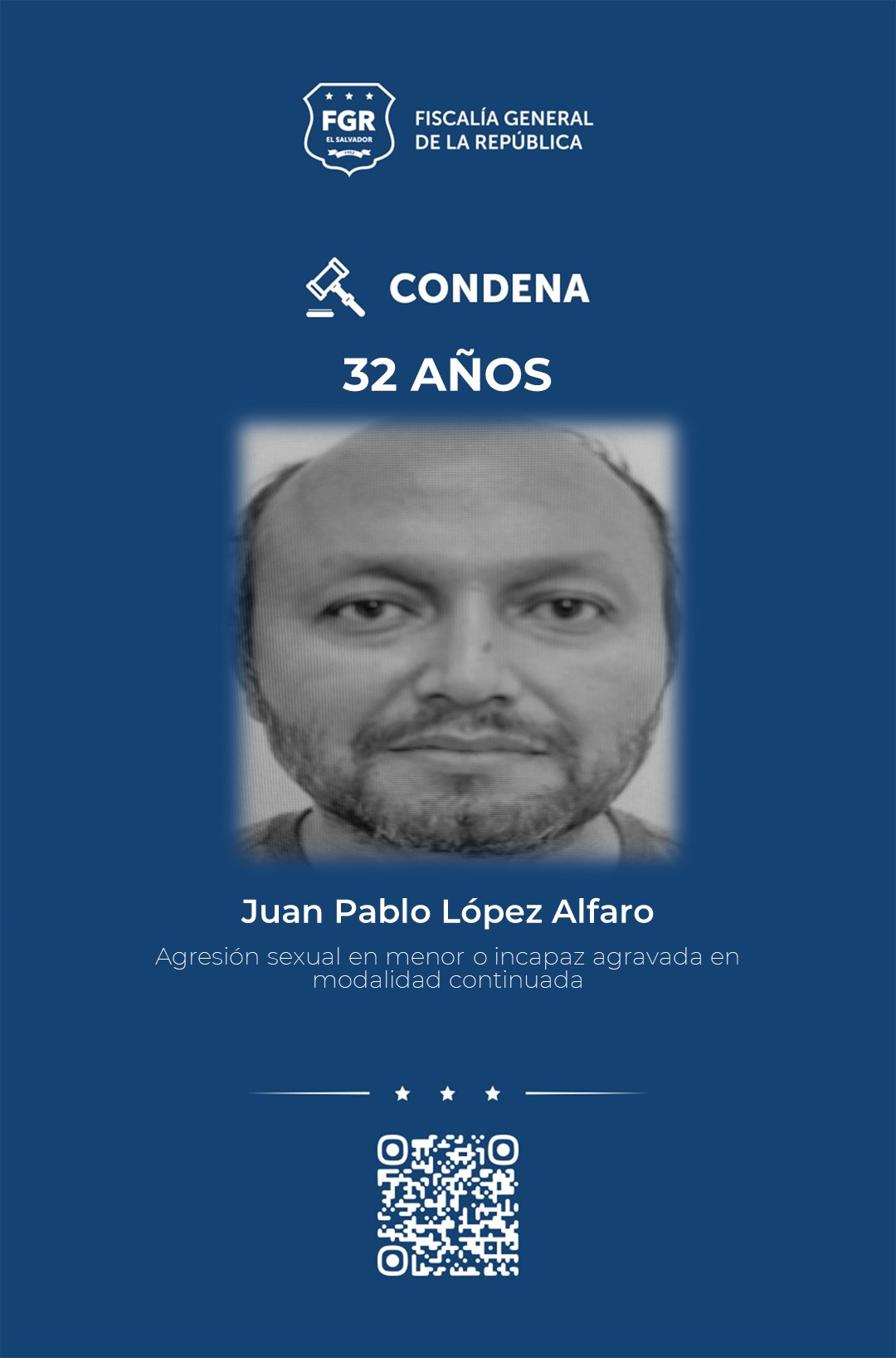 Alfaro fue condenado en ausencia y por el delito de agresión sexual en menor o incapaz agravada en modalidad continuada, gracias a la abundante prueba documental, pericial y testimonial que presentó la FGR ante el Tribunal Segundo de Sentencia de Santa Tecla.