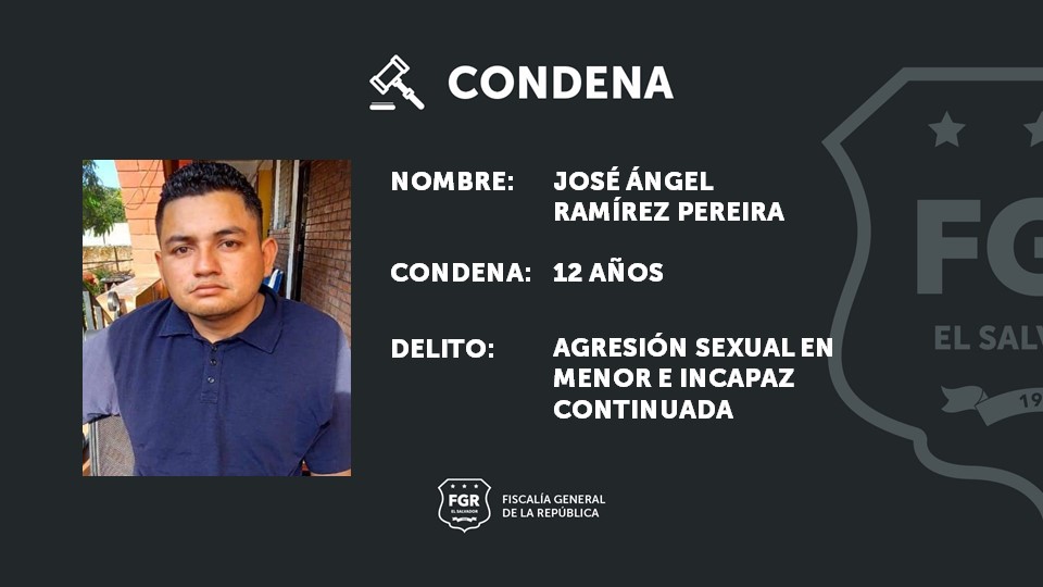 Sonsonate. José Ángela Ramírez Pereira fue condenado a 12 años de cárcel por haber agredido sexualmente a una menor de edad, en reiteradas ocasiones; los abusos fueron cometidos en en el caserío Palocombo, cantón Chiquihuat, municipio y departamento de Sonsonate.