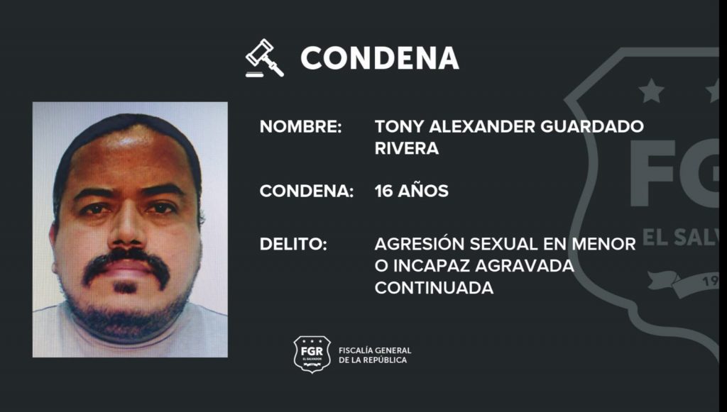 San Salvador. Tony Alexander Guardado Rivera, de 42 años de edad, deberá permanecer encarcelado durante los próximos 16 años, según lo ordenó un Tribunal capitalino al declararlo culpable por agredir sexualmente a una menor de edad.