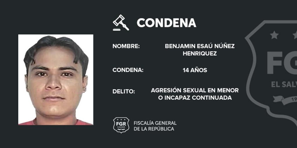 Chalatenango. Benjamín Esaú Núñez Henríquez fue sentenciado a 14 años de cárcel, por haber agredido sexualmente a una menor de 9 años, en reiteradas ocasiones en el municipio de Agua Caliente, Chalatenango.