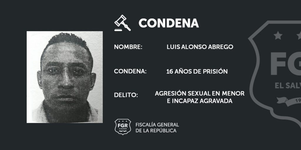 Abrego enfrentó la vista pública el 18 de julio 2021, en el Tribunal Segundo de Sentencia de Santa Tecla y fue procesado bajo el delito de Agresión Sexual en Menor e Incapaz Agravada. Para lograr una condena que hiciera justicia a la víctima, la representación fiscal presentó pruebas periciales, documentales y testimoniales, las cuales fueron avaladas por el juez del caso.