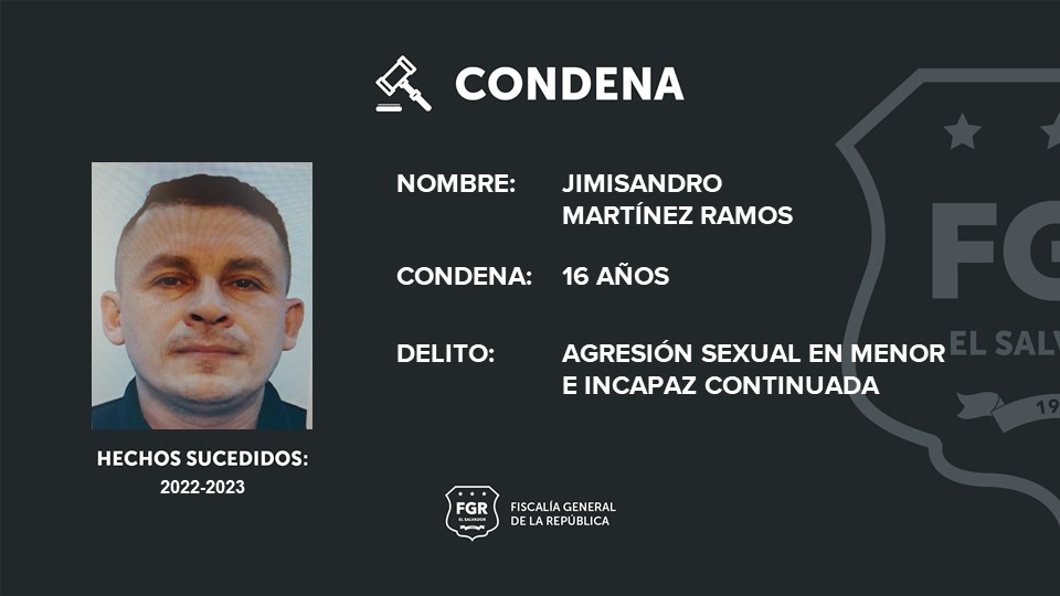 Soyapango. Jimisandro Martínez Ramos fue condenado a 16 años de prisión por el delito de agresión sexual en menor e incapaz agravada continuada en perjuicio de una niña.