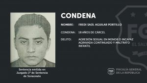Sonsonate. La Fiscalía General de la República logró que un tribunal le impusiera una condena de 18 años de prisión a Fredi Saúl Aguilar Portillo, por los delitos de Agresión Sexual en Menor o Incapaz Agravada Continuada y Maltrato Infantil en perjuicio de un Adolescente en perjuicio de una adolescente.