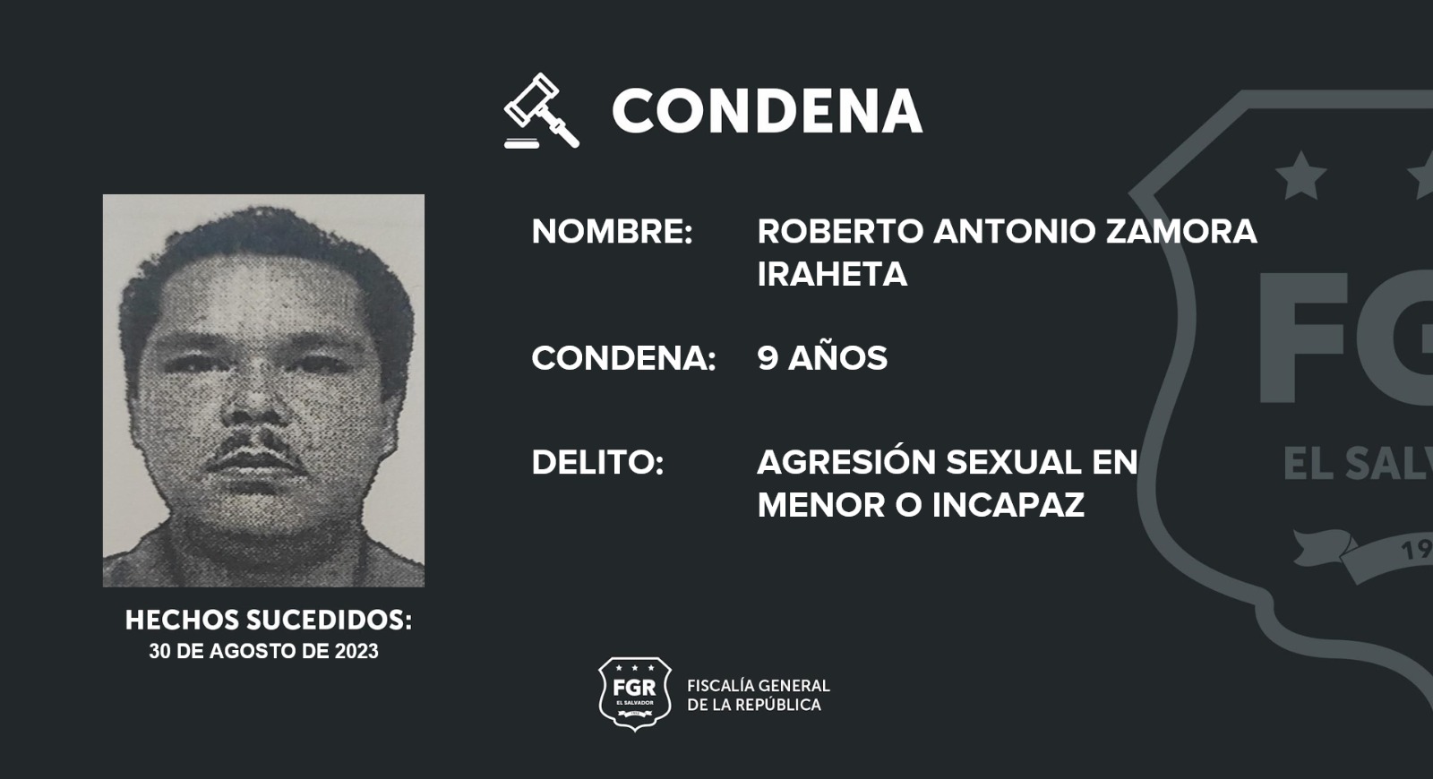 Cojutepeque, Cuscatlán. Roberto Antonio Zamora Iraheta fue sentenciado a 9 años de prisión por haber agredido a una menor de edad. En el juicio la Fiscalía presentó abundantes pruebas que demostraron la culpabilidad del imputado.