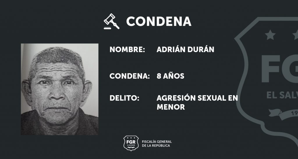 Zacatecoluca, La Paz. Adrián Durán fue condenado a ocho años de prisión, luego que la Fiscalía presentó abundantes pruebas de que él había agredido sexualmente a una menor de edad. Los abusos ocurrieron en una colonia del municipio de Zacatecoluca, departamento de La Paz.