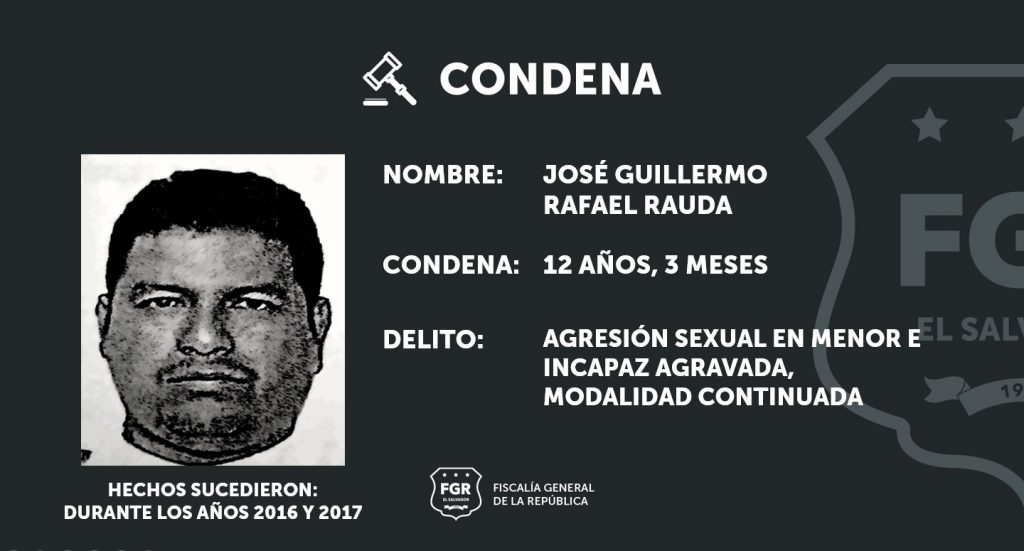 Cojutepeque, Cuscatlán. Debido al trabajo investigativo realizado por las fiscales, fue posible condenar a José Guillermo Rafael Rauda a 12 años y 3 meses de prisión por el delito de agresión sexual en menor e incapaz agravada, modalidad continuada.