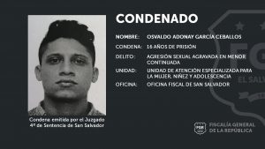 San Salvador. Fiscales de la Unidad de Atención Especializada para la Mujer, Niñez y Adolescencia de la sede fiscal de San Salvador lograron que el agresor Osvaldo Adonay García Ceballos recibiera una condena de 16 años de cárcel, por el delito de Agresión Sexual Agravada en Menor Continuada.