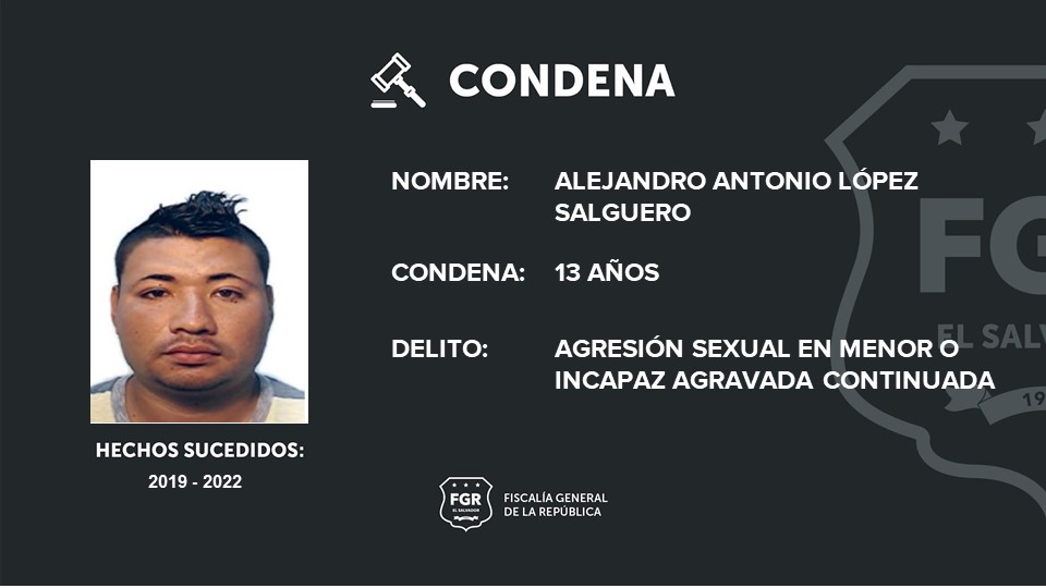 Chalatenango.  Alejandro Antonio López Salguero fue condenado a 13 años de cárcel por el delito de agresión sexual en menor o incapaz agravada continuada; la víctima fue una menor, quien fue abudada desde que tenía siete años de edad.