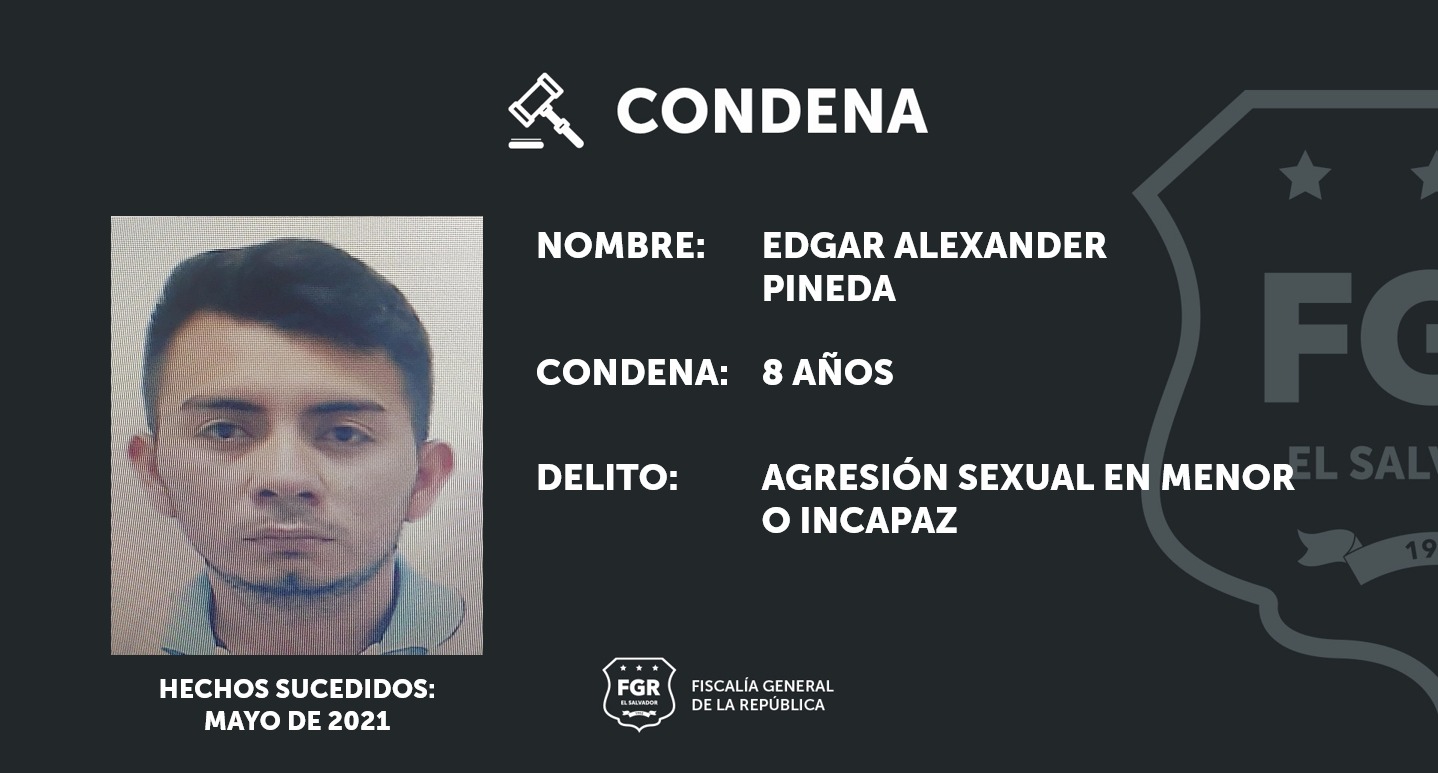 Cojutepeque, Cuscatlán. Gracias a las pruebas presentadas por las fiscales fue posible condenar a Edgar Alexander Pineda a ocho años de prisión, por el delito de agresión sexual en menor o incapaz.