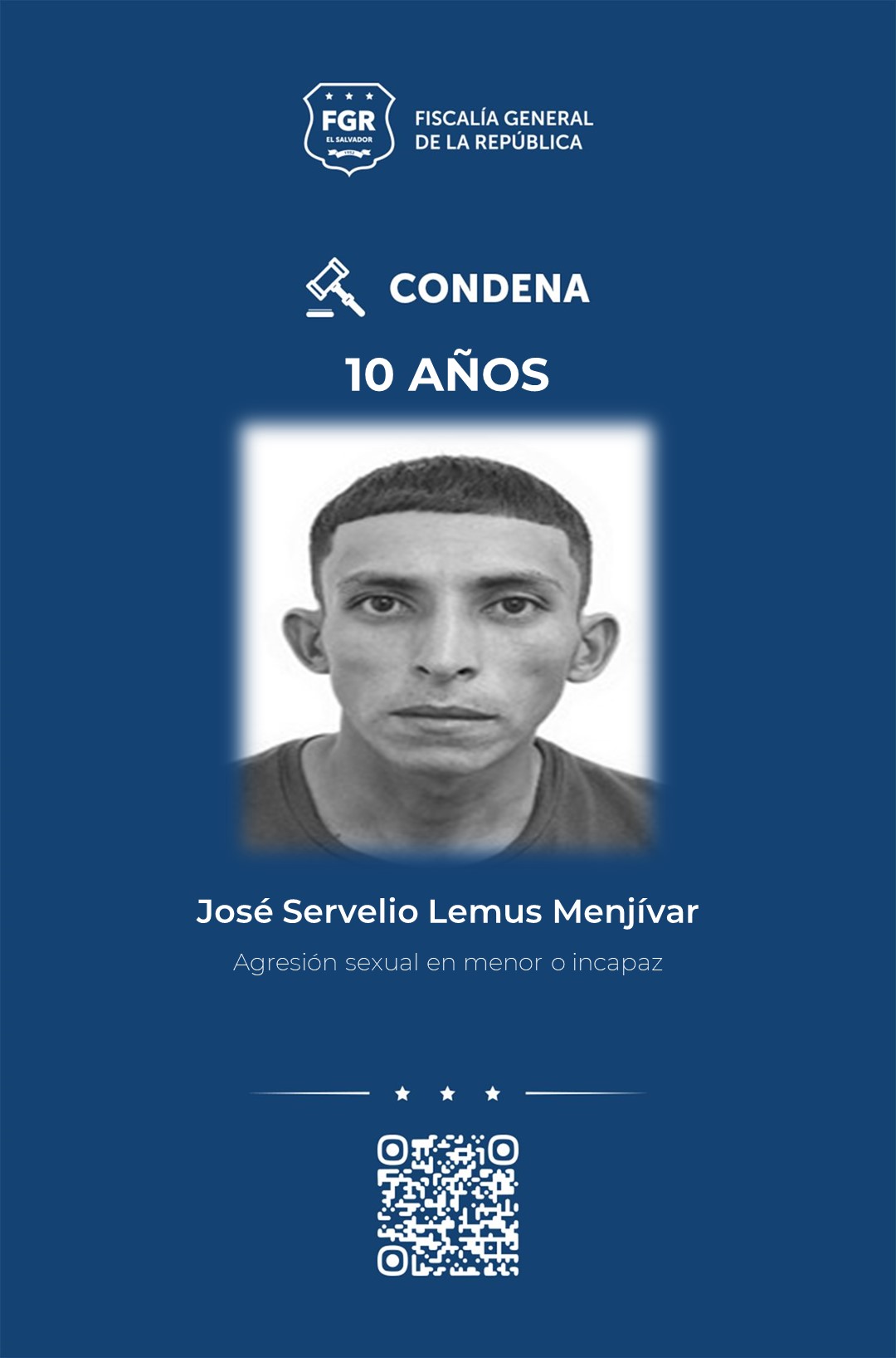 Chalatenango. Diez años de prisión recibió José Servelio Lemus Menjívar por haber tocado indebidamente las partes íntimas de una niña de cinco años de edad, durante el 2024 en Nueva Concepción, Chalatenango Centro.