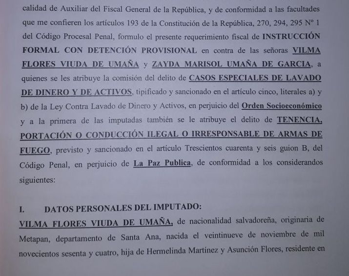 Siempre en el marco de la misma operación, la Unidad de Investigación Financiera (UIF) de la FGR reportó que el Juzgado 2º Paz Metapán decretó la instrucción con detención a Vilma Flores viuda de Umaña y Zaida Marisol Umaña de García, por Lavado de Dinero y Tenencia ilegal de Arma. Las imputadas están ligadas a la misma red que operaba en el Occidente del país.