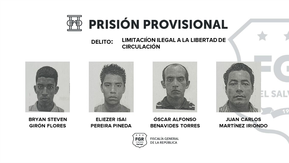 Los imputados que procesados por el delito de limitación a la libertad de circulación, son: José Alexander Valiente Quintanilla, Ángel Ezequiel Marroquín Aguilar, José Eduardo Aguilar Escobar, Cesar Fernando Larin Vega, Luis Fernando Portillo Sandoval, Juan Carlos Martínez Iriondo, Óscar Alfonso Benavides Torres, Eliezer Isaí Pereira Pineda y Bryan Steven Girón Flores.