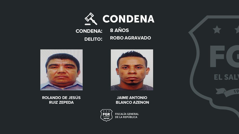 Ahuachapán. En un juicio, la Fiscalía General de la República (FGR) demostró que Jaime Antonio Blanco Azenon y Rolando de Jesús Ruiz Zepeda fueron responsables del robo cometido en una parada de buses de Ahuachapán; por ello se les impuso una condena de ocho años de cárcel.