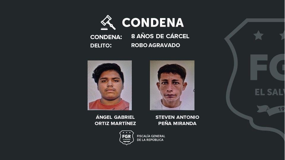 La Libertad. En juicio la Fiscalía demostró que Steven Antonio Peña Miranda y Ángel Gabriel Ortiz Martínez fueron los responsables de un asalto ocurrido en el kilómetro 41 y colonia San Carlos de Ciudad Arce, departamento de La Libertad, el 24 de diciembre de 2023.