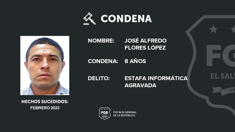 San Salvador. Luego que la Fiscalía demostró en vista pública la culpabilidad de José Alfredo Flores López que fue condenado a pasar ocho años encerrado en la cárcel por haber cometido el delito de estafa informática agravada. Los hechos por los que López fue condenado ocurrieron en febrero del año 2022.