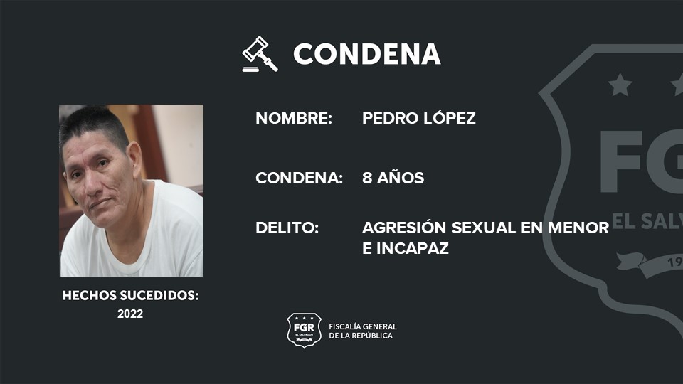 Zaragoza, La Libertad Este. La Fiscalía General de la República (FGR) logró ocho años de cárcel para Pedro López por agredir sexualmente a una niña de 6 años de edad.