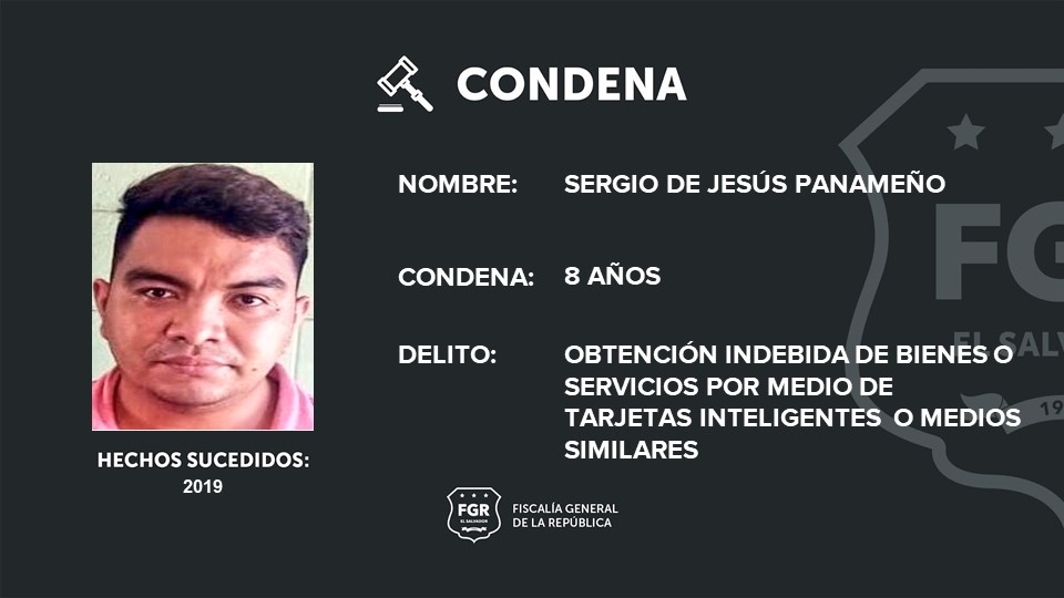 Zaragoza, La Libertad. Sergio de Jesús Panameño fue sentenciado a ocho años de cárcel por haber hurtado la tarjeta de débito de su compañera de trabajo y con la misma realizó compras electrónicas inapropiadas por la cantidad de $1,871.99 dólares. Dichos hechos fueron comprobados en juicio por la Fiscalía.