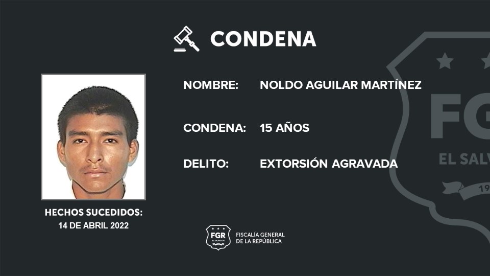 Ahuachapán. William Adonay Rojas Arias, Elto Francisco Ramos, César Ernesto Aguilar Martínez, Noldo Aguilar Martínez y José Ovelio Aguilar Martínez son los cinco pandilleros de MS que amenazaron y exigieron a su víctima el pago de $500 dólares a cambio de no quitarle la vida. Para los imputados la Fiscalía logró una condena de quince años de cárcel.