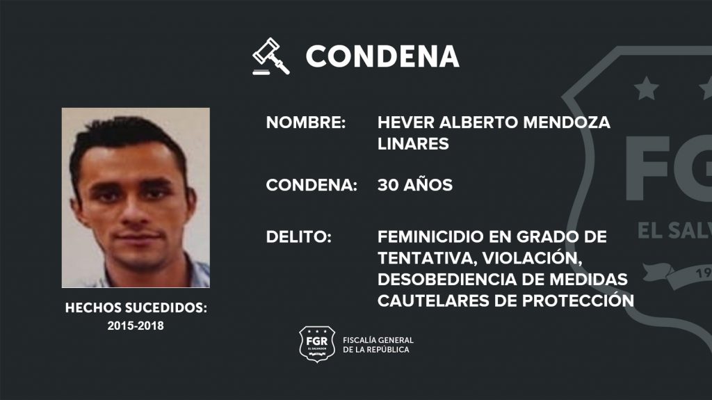 San Miguel. La Fiscalía General de la República logró que Hever Alberto Mendoza Linares sea condenado, mientras se encuentra preso en Estados Unidos; lo anterior, gracias al trabajo de la Dirección de Asuntos Legales Internacionales que hizo posible que a través de audiencias virtuales, el imputado recibiera una pena de 30 años de prisión por intentar asesinar a su pareja.