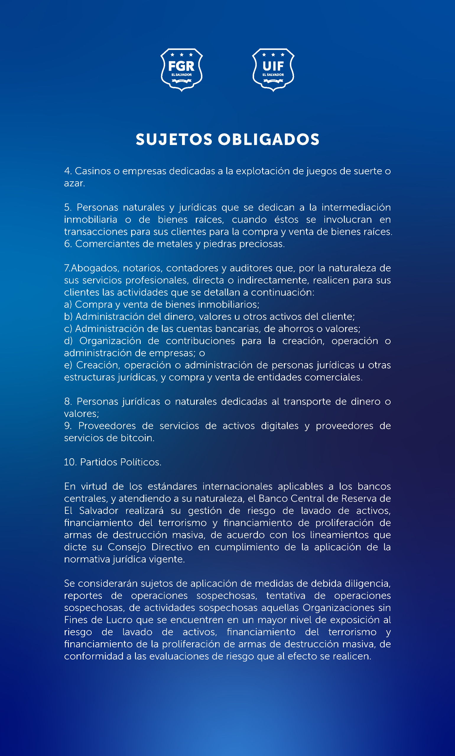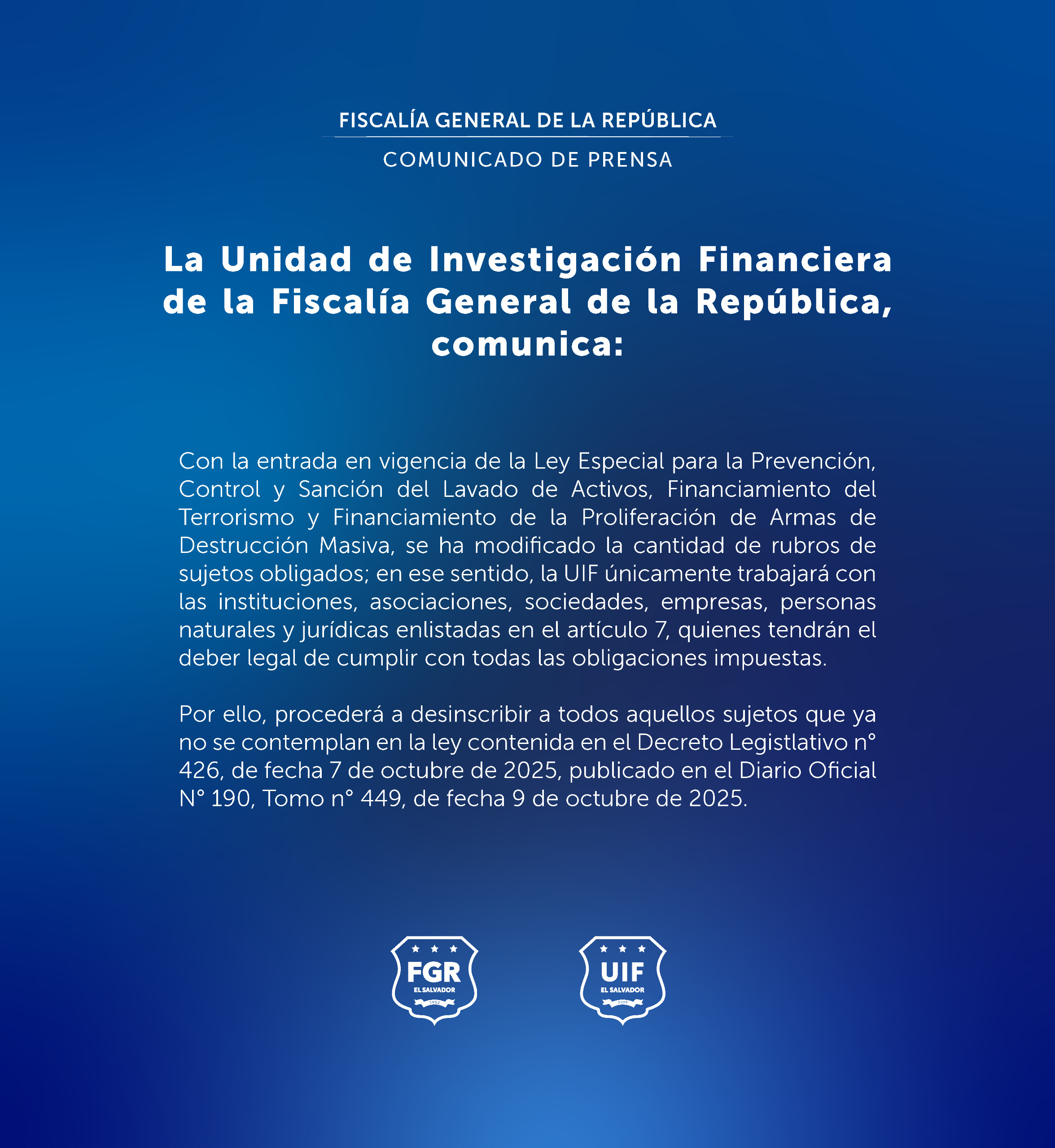 » Con la entrada en vigencia de la Ley Especial para la Prevención, Control y Sanción del Lavado de Activos, Financiamiento del Terrorismo y Financiamiento de la Proliferación de Armas de Destrucción Masiva, la UIF comunica: