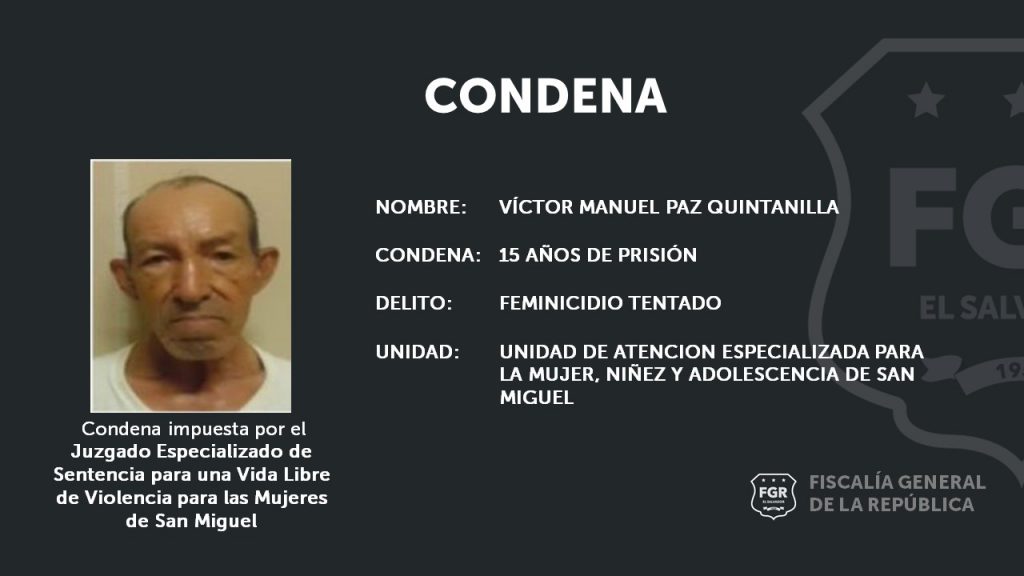 San Miguel. Por el delito de Feminicidio Tentado, Víctor Manuel Paz Quintanilla de 65 años, recibió una condena de 15 años de prisión, aseguró la Fiscalía Adjunta para la Mujer, Niñez y Adolescencia y otros grupos vulnerables.