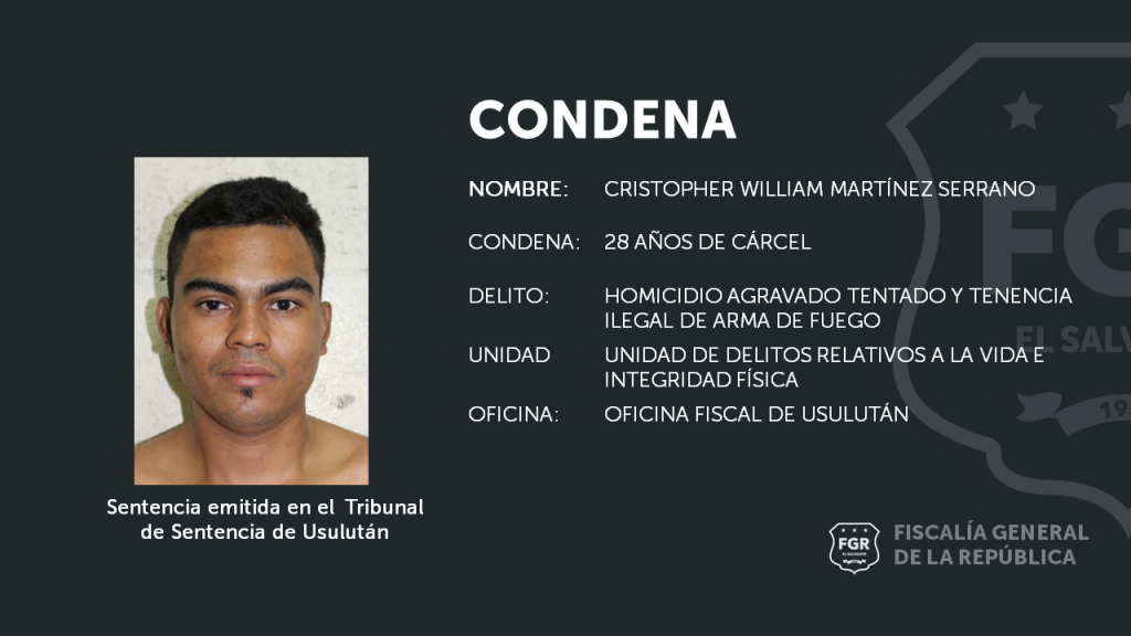 Usulután. Por los delitos de Homicidio Agravado Tentado y Tenencia Ilegal de Arma de Fuego, Cristopher William Martínez Serrano recibió una condena de 28 años de cárcel, afirmó el Fiscal del caso de la Unidad de Vida de la oficina de Usulután.