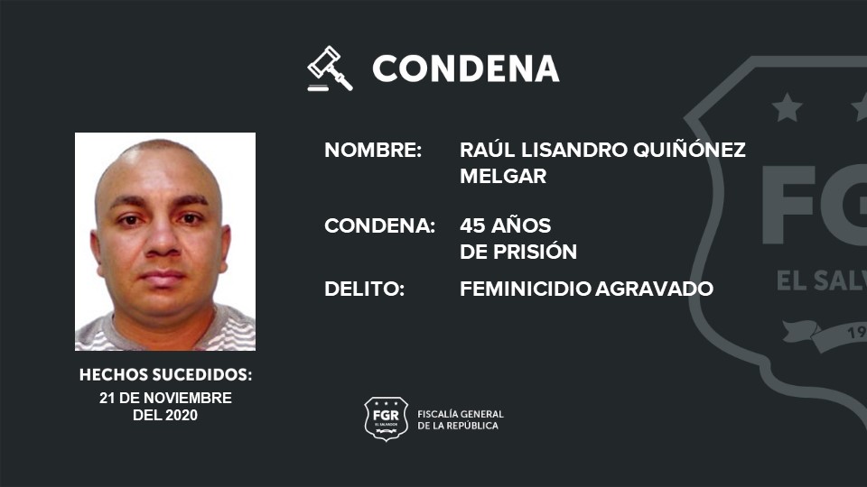 Santa Ana. Raúl Lisandro Quiñónez Melgar, implicado en uno de los crímenes cometidos en 2020 en Chalchuapa, Santa Ana, fue declarado responsable de un feminicidio agravado y fue condenado a una pena de 45 años de prisión.