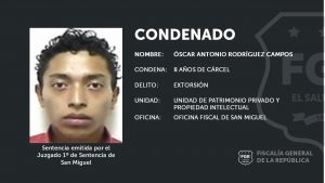 San Miguel. Oscar Antonio Rodríguez Campos confesó voluntariamente haber participado en el delito de Extorsión, y recibió una pena de cárcel de 8 años.