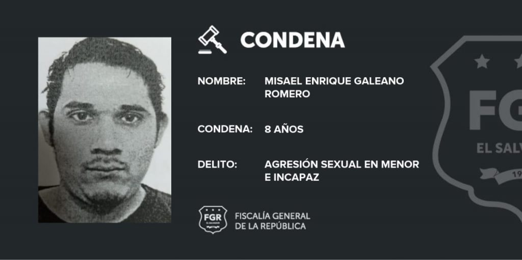La Libertad. Misael Enrique Galeano Romero fue condenado a ocho años de cárcel y al pago de $500 dólares, por haber agredido sexualmente a una menor de cinco años.