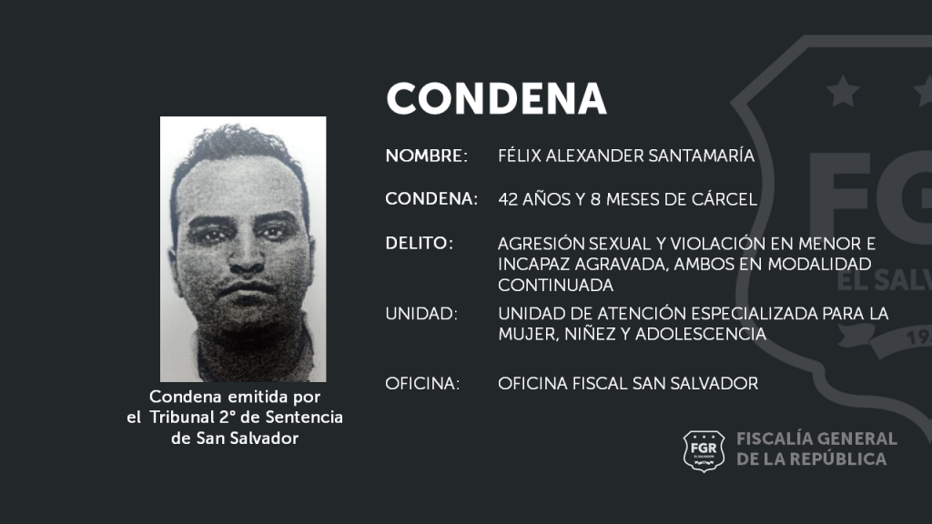 San Salvador. Fiscales de la Unidad de Atención Especializada para la Mujer de la oficina de San Salvador lograron demostrar durante el desarrollo de la Vista Pública realizada por el Juzgado Segundo de Sentencia de esta capital, la participación delincuencial de Félix Alexander Mancía Santamaria en los delitos de Violación y Agresión Sexual en perjuicio de una misma víctima, recibiendo una pena carcelaria de 42 años con 8 meses de prisión.