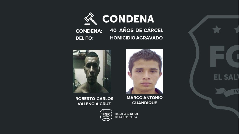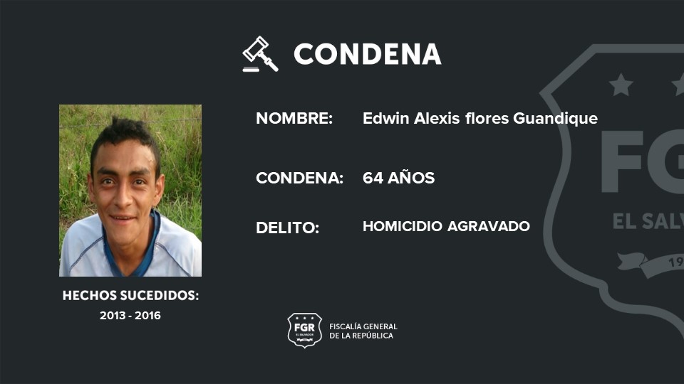 Además, Edwin Alexis Flores Guandique, alias cusuco, fue condenado a 60 años de cárcel y a 40 Roberto Carlos Valencia Cruz, alias pajilla y Marco Antonio Guandique, alias duende.