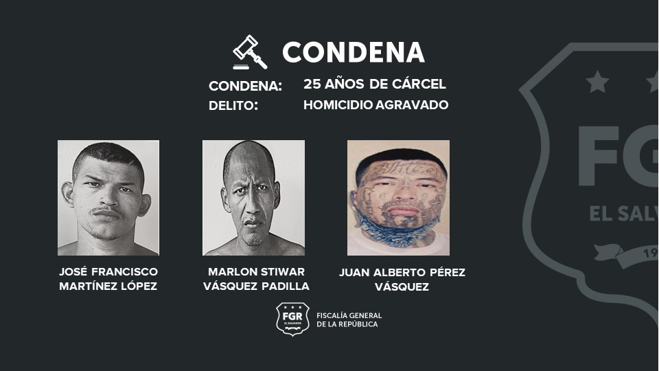 Durante el juicio, el Juzgado Primero de Sentencia de Sonsonate valoró las pruebas que presentó la Fiscalía e impuso la condena de 25 años por homicidio agravado para los siguientes siete pandilleros: Carlos Antonio Vásquez Santiago, Manfredy Salgado Carranza, Jonathan Jimmy Áviles Valle, José Manuel de Jesús Hernández Castro, José Francisco Martínez López, Marlon Stiwar Vásquez Padilla y Juan Alberto Pérez Vásquez.