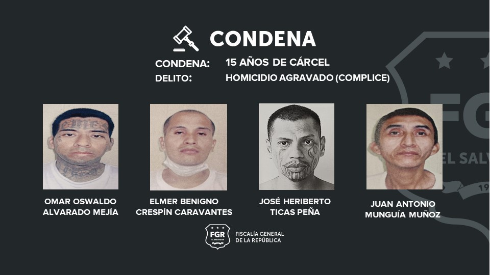 Por ser cómplices en ese asesinato, el juzgado sentenció a 15 años de cárcel a para Omar Oswaldo Alvarado, Elmer Benigno Crespín Caravantes, José Heriberto Ticas Peña, Alexander Pérez Zacapa, Juan Antonio Munguía Muñoz y Carlos Ismael Mejía.