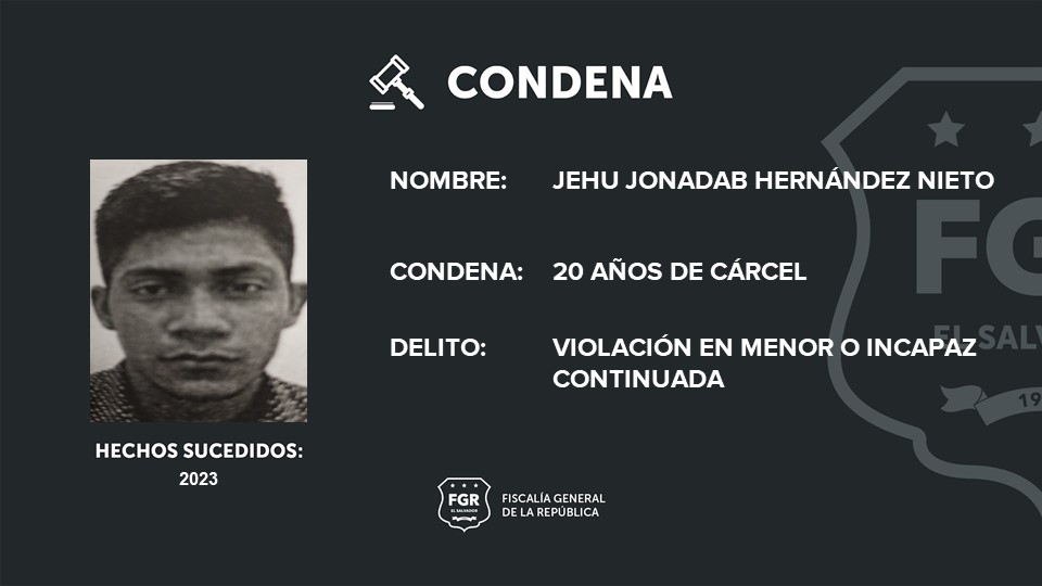 La Libertad Sur Zaragoza.  A 20 años de prisión fue condenado Jehu Jonadab Hernández Nieto por haber abusado sexualmente de una adolescente de 13 años de edad, durante agosto, noviembre y diciembre del 2023. Los abusos ocurrieron en reiteradas ocasiones en Tamanique, La Libertad Costa.