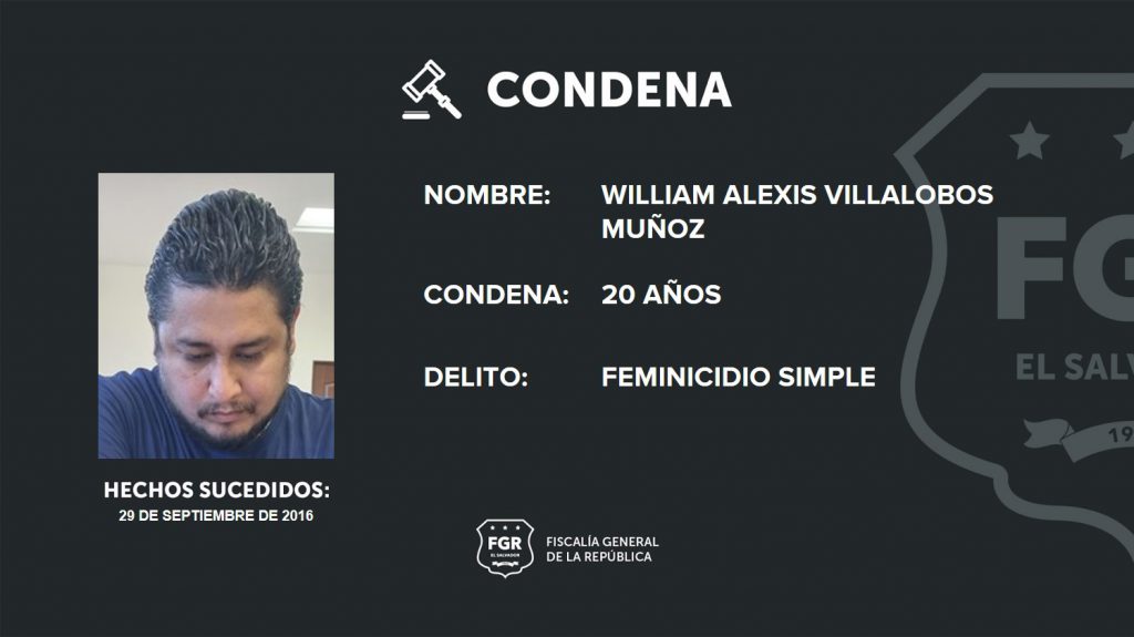 San Salvador. La Fiscalía una vez más hizo justicia para una mujer que fue asesinada por su excompañero de vida y logró que William Alexis Villalobos Muñoz fuera condenado a 20 años de prisión. Al imputado se le acusa de haber cometido el delito de feminicidio simple.