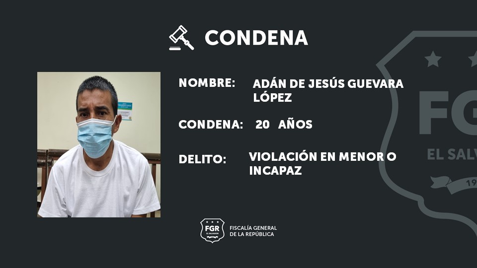 San Miguel. Gracias a las pruebas presentadas por la Fiscalía General de la República (FGR), Adán de Jesús Guevara López fue condenado a 20 años de prisión por Violación en Menor o Incapaz. Guevara López enamoró a la niña de 11 años con mensajes de textos y posteriormente la violó.