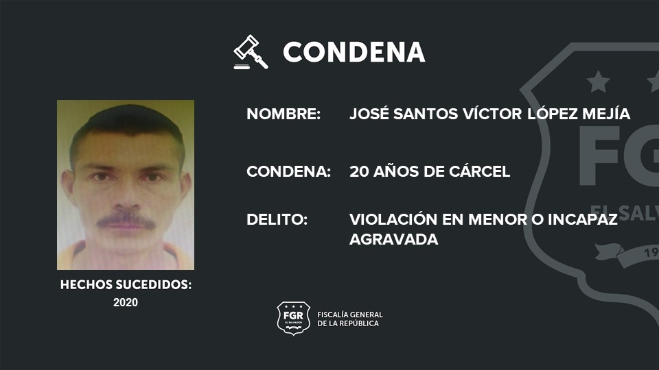 La Libertad Este. A 20 años de cárcel fue condenado José Santos Víctor López Mejía por haber violado a una niña de 10 años en San José Villanueva, La Libertad Este, durante el 2020.