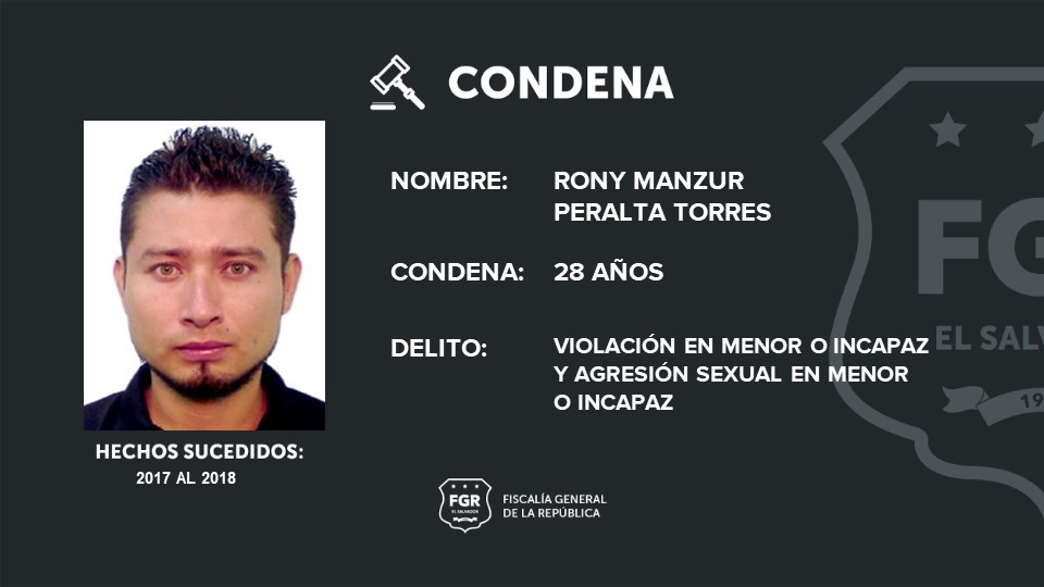San Salvador. La Fiscalía General de la República logró que Rony Manzur Peralta Torres fuera condenado a 28 años de prisión por violación contra una menor de edad.