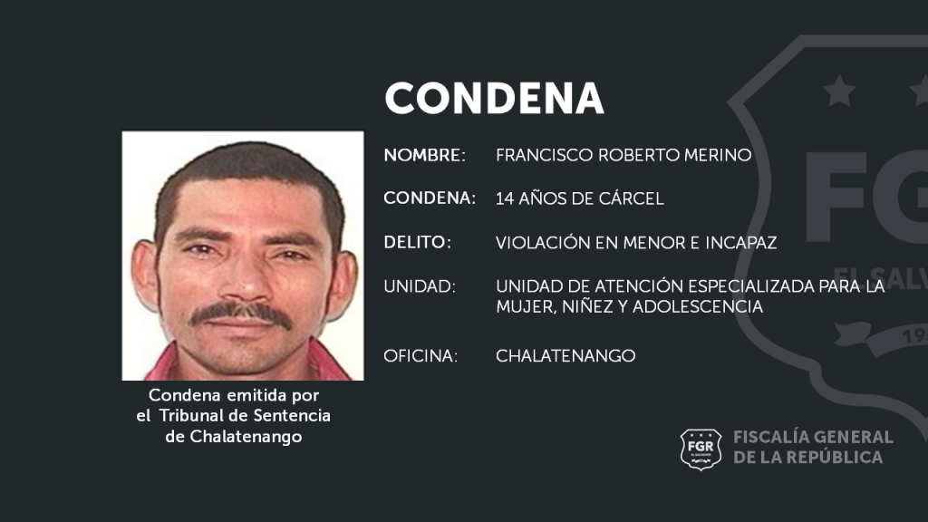 Chalatenango: Francisco Roberto Merino Cruz, alias “Perro Negro”, fue sentenciado a cumplir 14 años de prisión, después que fiscales de La Unidad de Atención Especializada para la Mujer, Niñez y Adolescencia en Chalatenango, lograran establecer la comisión del delito de Violación en Menor e Incapaz en perjuicio de una víctima de 10 años.