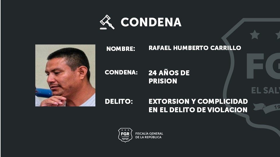 San Salvador. Rafael Humberto Carrillo y Jeny Arely Mejía Pérez fueron condenados a más de 24 y 10 años de prisión, respectivamente, luego que la Fiscalía logró establecer que fueron los responsables de extorsionar a una menor de edad y de consentir la violación de ella, por parte del hijo de ambos -en el caso de Carrillo-.