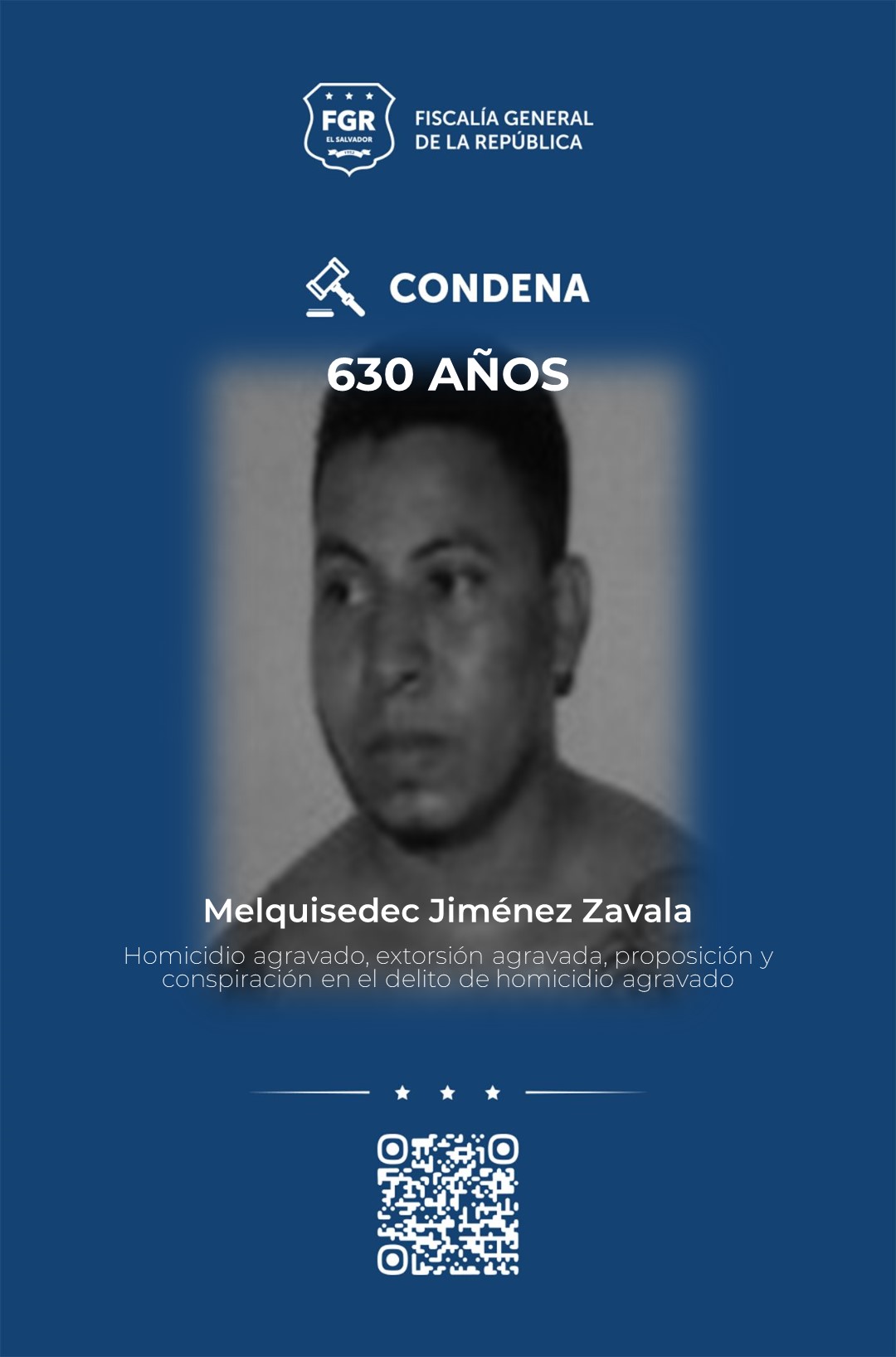 El Tribunal Segundo contra el Crimen Organizado, juez D, de San Miguel, condenó a Gerber Natividad López Mejía (rebelde) a  650 años de prisión homicidio agravado y extorsión agravada,  Melquisedec Jiménez Zavala (rebelde), fue condenado a 630 años homicidio agravado, extorsión agravada y  proposición y conspiración en el delito de homicidio agravado en perjuicio de un agente policial.