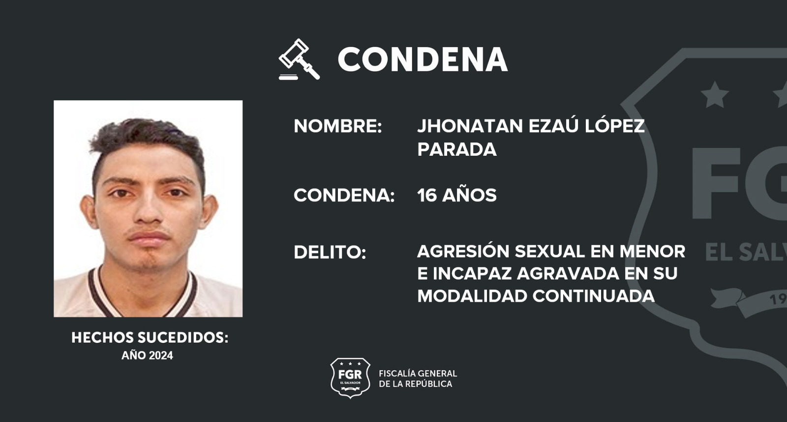 Apopa, San Salvador Oeste. Jhonatan Ezaú López Parada fue condenado a 16 años de prisión, por el delito de agresión sexual en menor e incapaz agravada, en su modalidad continuada. La sentencia de cárcel se logró gracias a las pruebas presentadas por los fiscales.