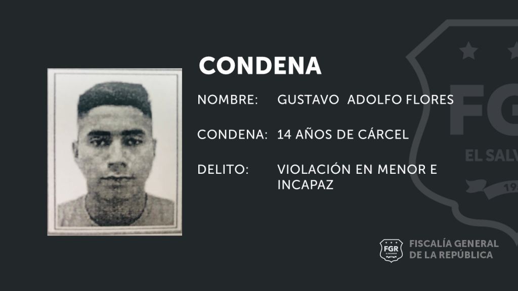 Cojutepeque. Fiscales de la Unidad de Atención Especializada para la Mujer de la oficina de Cojutepeque lograron que el Tribunal de Sentencia de Cojutepeque aceptara y valorara los elementos probatorios presentados en la acusación por violación de una menor de edad en contra de Gustavo Adolfo Flores Ramírez, imponiéndole una pena carcelaria de 14 años y una responsabilidad civil de US $2,000.00.