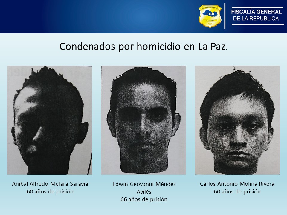 La Paz. La Unidad de Vida e Integridad Física de la oficina Fiscal de Zacatecoluca obtuvo las condenas entre 60 y 66 años de cárcel, contra tres miembros de una estructura terrorista por el Homicidio Agravado de Rony Alexander Jandres Orellana, conocida socialmente como “Yasuri”, y Daniel Antonio Rodríguez Hernández, “Daniela”, ambos miembros de la comunidad LGTBI; informó el jefe de esta sede Fiscal, Daniel Domínguez.