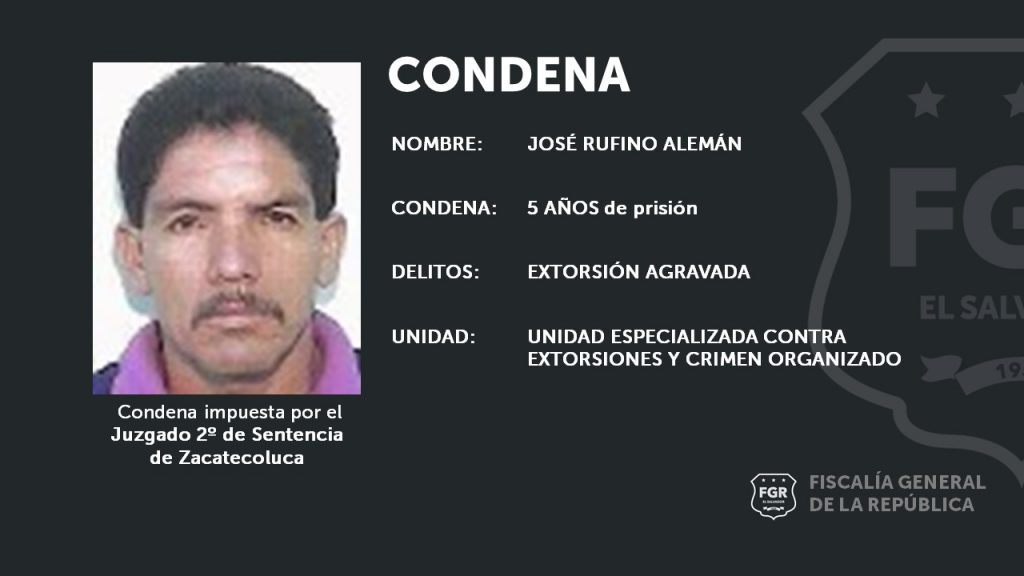 El otro caso con fallo condenatorio se obtuvo en el Tribunal Segundo de Sentencia de Zacatecoluca, en donde compareció José Rufino Alemán, alias “Viejo Crazy”, acusado el delito de Extorsión Agravada. El antisocial es remanente de una estructura extorsionista y quienes ya cumplen diferentes años de cárcel.