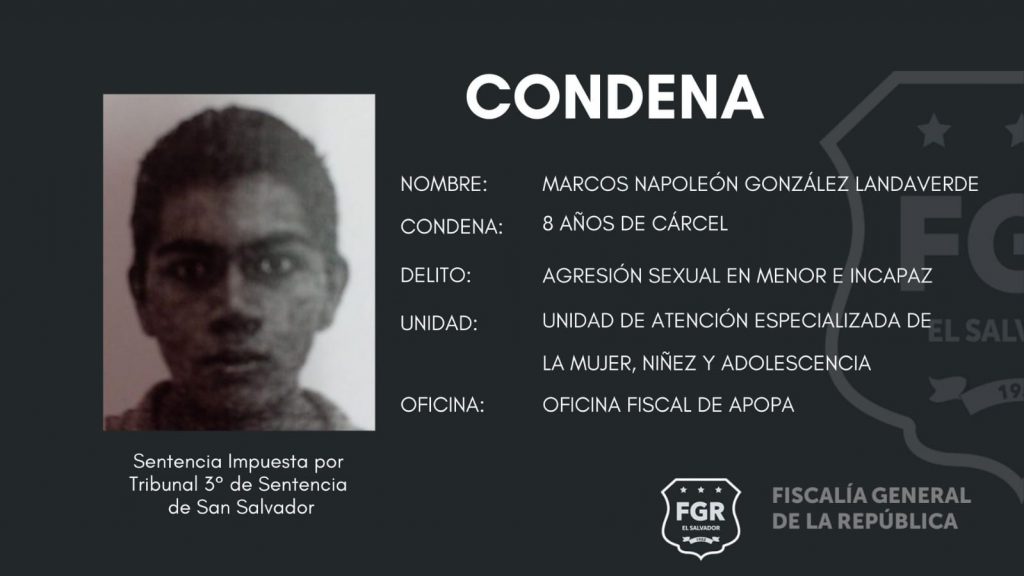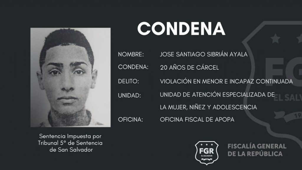 La Unidad de Atención Especializada para la Mujer, la Niñez y la Adolescencia de la Oficina Fiscal de Apopa dio a conocer que el primer caso fue en contra del imputado José Santiago Sibrián Ayala, de 23 años, quien enfrentó vista pública ante el Tribunal Quinto de Sentencia, de San Salvador. El delito que se le atribuyó es Violación en Menor e Incapaz en la modalidad Continuada, en perjuicio de una menor de 13 años.