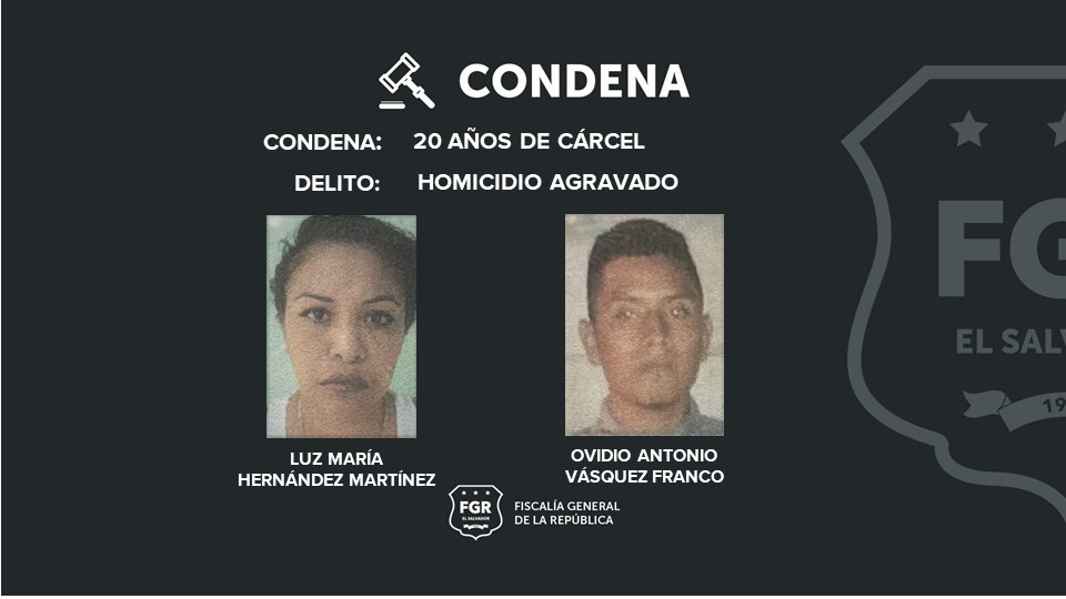 San Marcos, San Salvador Sur. Luz María Hernández Martínez y Ovidio Antonio Vásquez Franco fueron sentenciados a 20 años de prisión y Rubén Alonso Guerra Torres a 28 años de prisión por un crimen cometido en el distrito de San Marcos, San Salvador Sur. Los imputados fueron perfilados como miembros de la MS-13.
